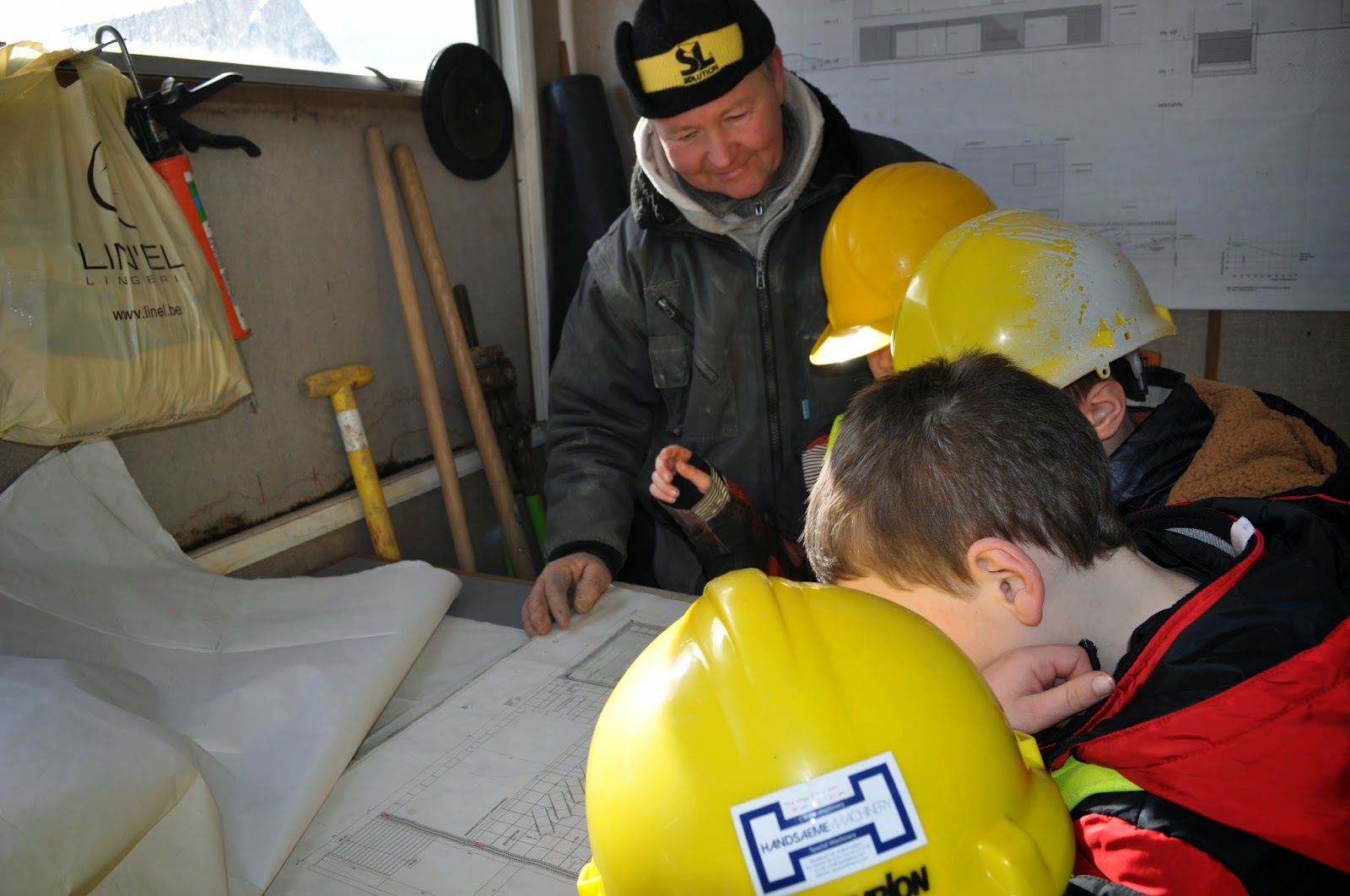 In de werfkeet mochten we naar de plannen kijken. De kraanman kwam ons vertellen hoe je de kraan bedient en ook wij mochten dit eens uitproberen. Als afsluiter mochten we zelf een klein muurtje metselen. Met de waterpas controleerden we of het recht stond.