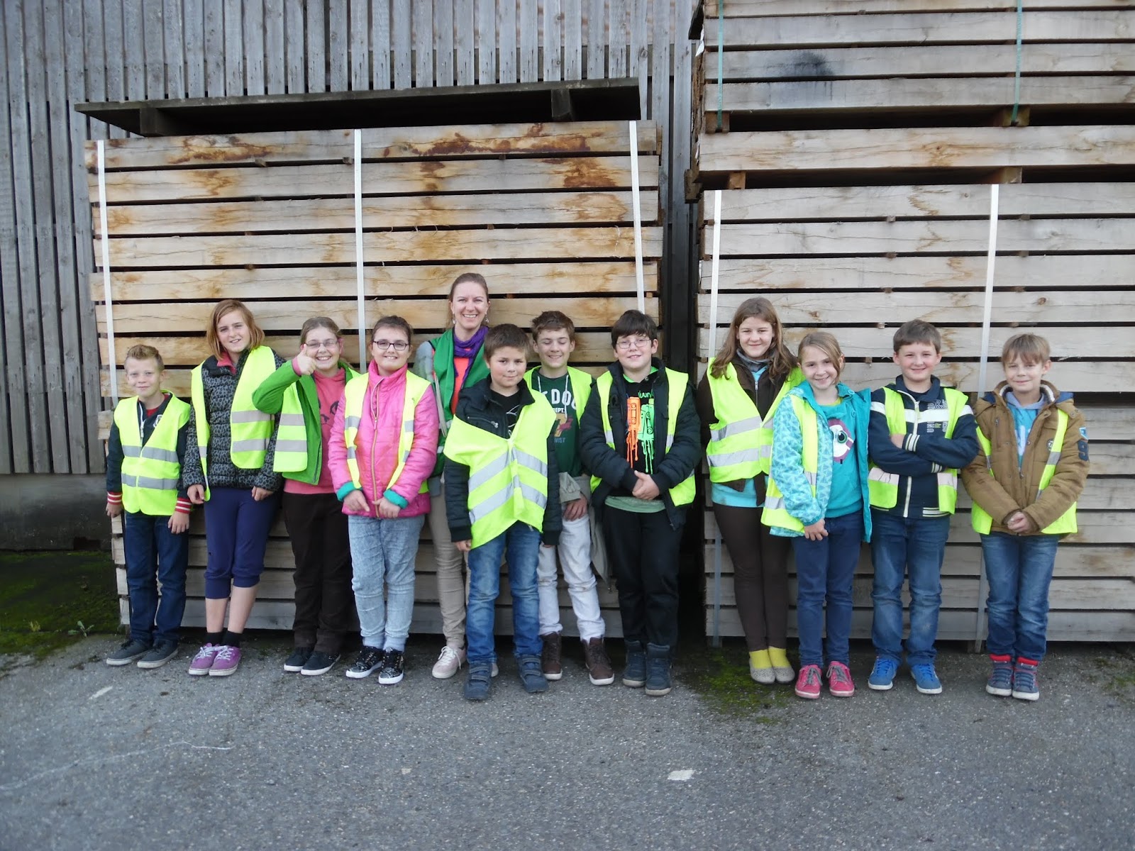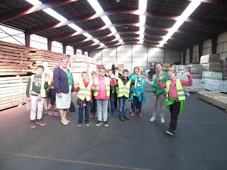 Van boomstammen worden houten planken en balken gemaakt. We zagen een elektrische zaagmachine aan het werk, een supergrote droogoven voor hout, allerlei soorten hout in alle maten gestapeld, een heftruck die grote balken vervoerde,... we keken onze ogen uit!