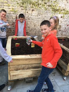 We zaaiden: tomaten, radijzen, pompoenen en bloemetjes! We vonden dit superleuk en zijn erg nieuwsgierig naar wanneer en wat er eerst zal uitkomen! We geven ze alvast genoeg water en beschermen ze met een soort 'serre' te maken met een plastiek fles!
