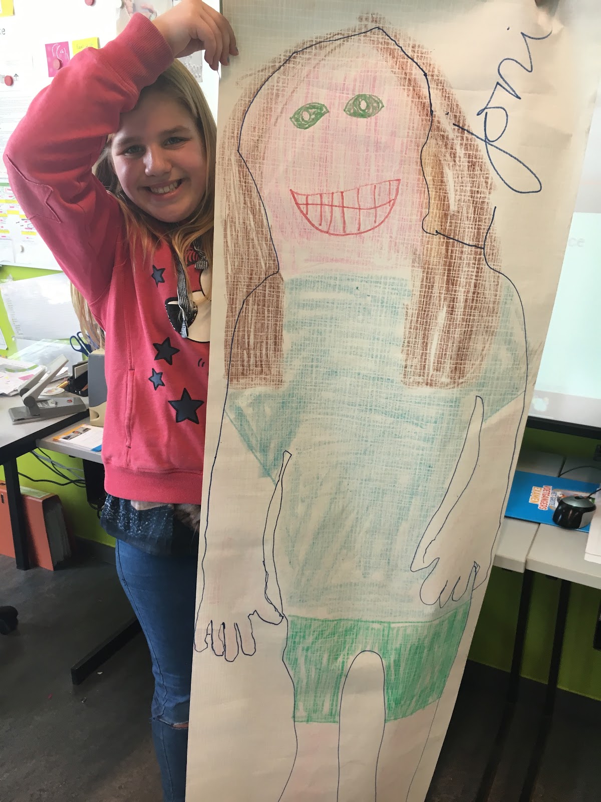 Elkaar aftekenen en jezelf inkleuren op behangpapier: even groot als echt! Tof!
