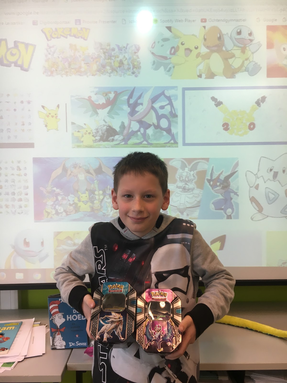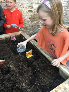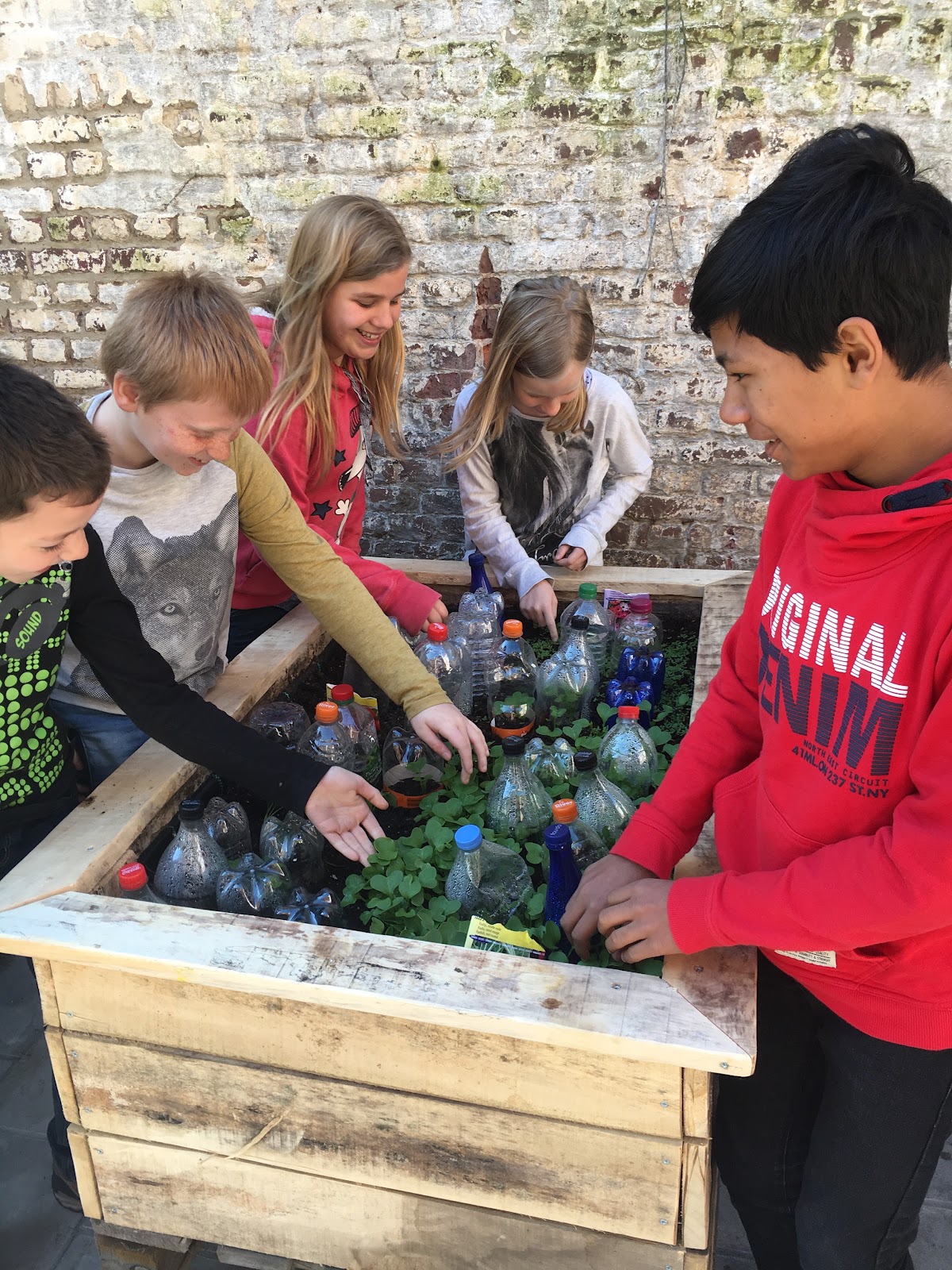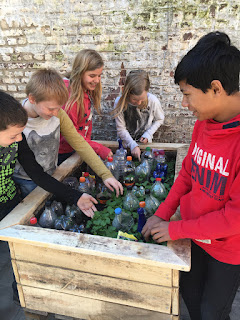 Trots op onszelf, onze plantenbak met groeiende radijzen, bloemen, pompoenen en tomaten, onze boekenbox en ons wo-thema 'van katoen tot broek'. Alle foto's op