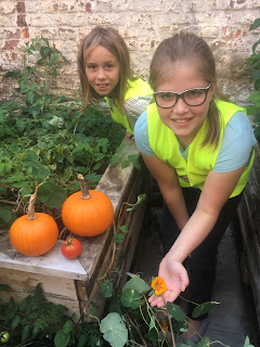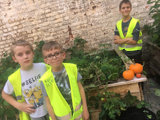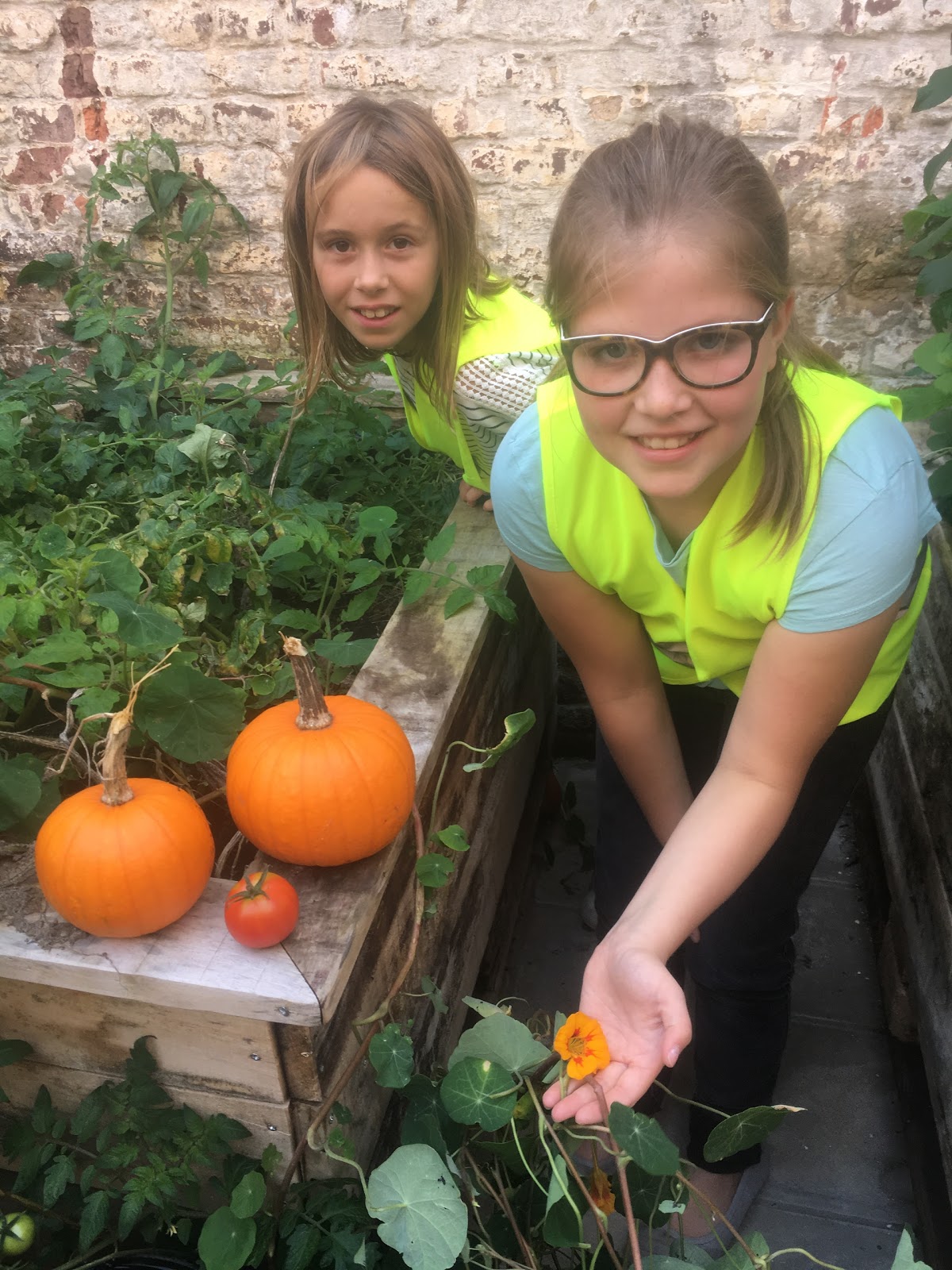 2 pompoenen en 1 tomaat in de plantenbak van de Memory's! Lekker!