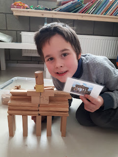 Ook in de klas had juf leuke hoekjes voorzien. Zo konden ze met houten blokjes en een foto een beroemd gebouw namaken !! Herken je welk gebouw Ian maakte?