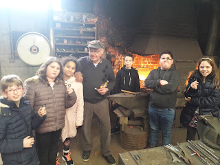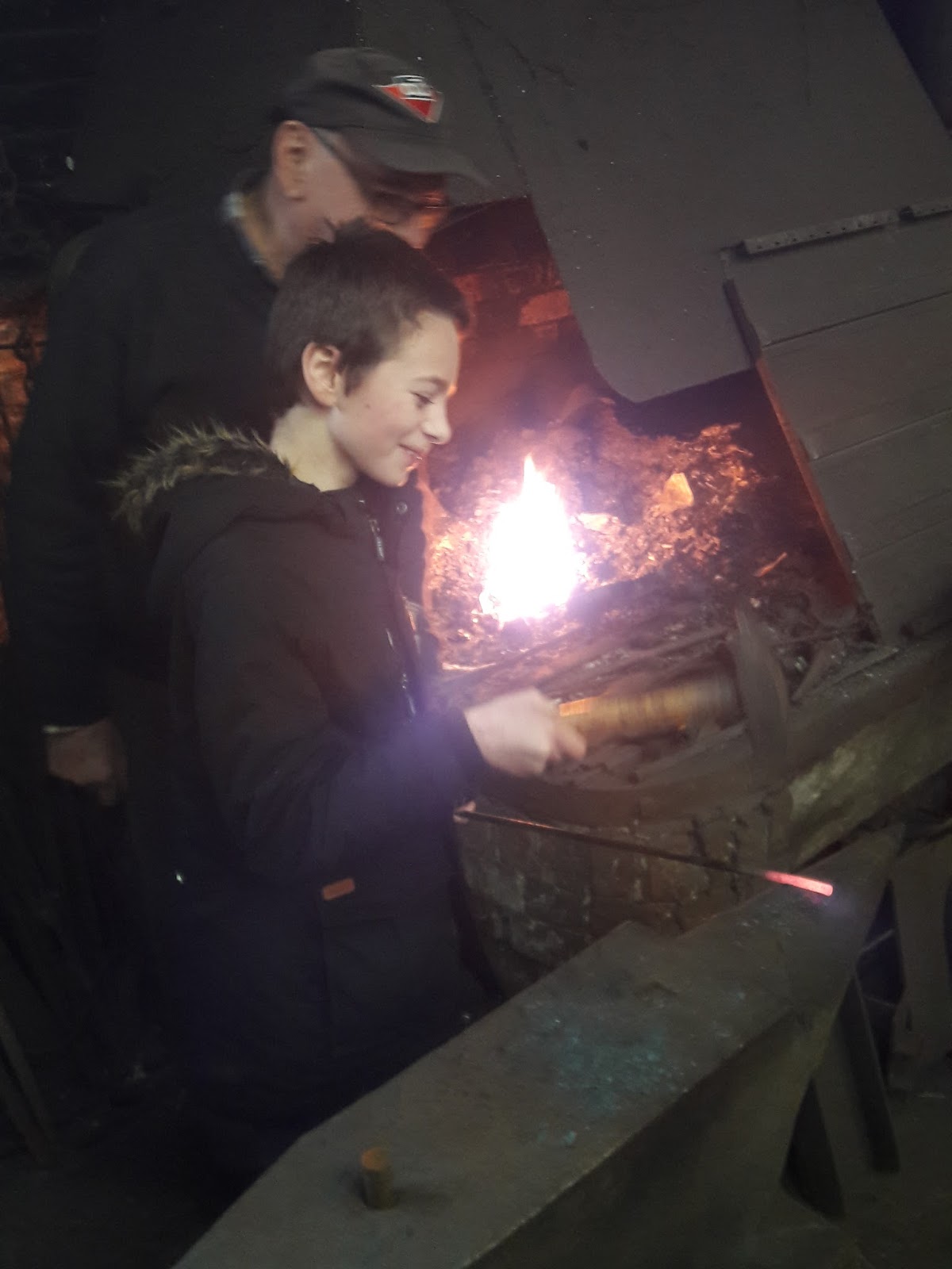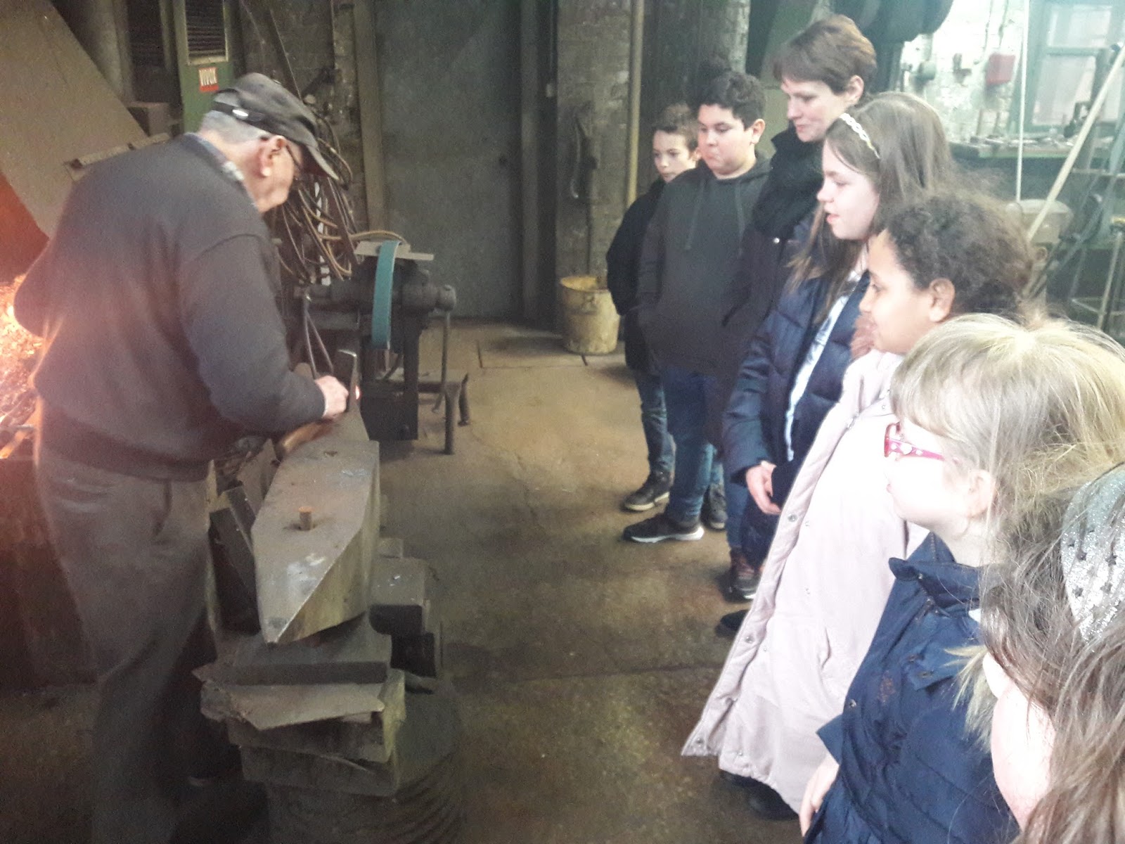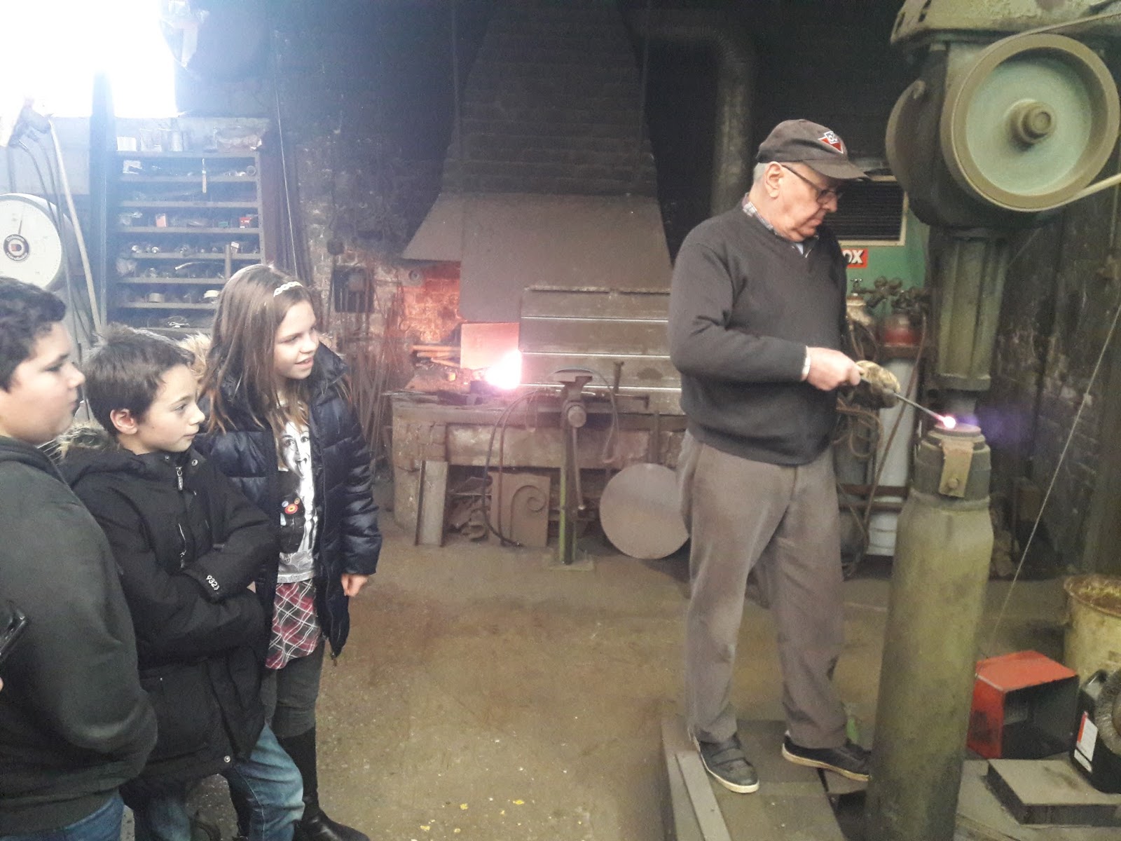 De domino's mochten even op bezoek gaan bij de smid. Deze werkte nog op ambachtelijke wijze in zijn smidse. Het werd een boeiende ontmoeting en de kinderen waren heel gefascineerd door het beroep van de smid. Er mochten ook enkele leerlingen zelf eens proberen om wat te smeden.