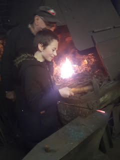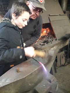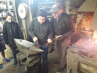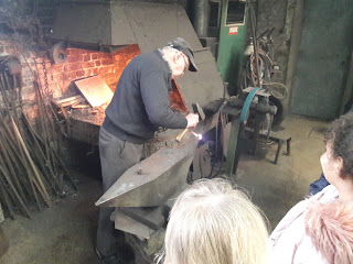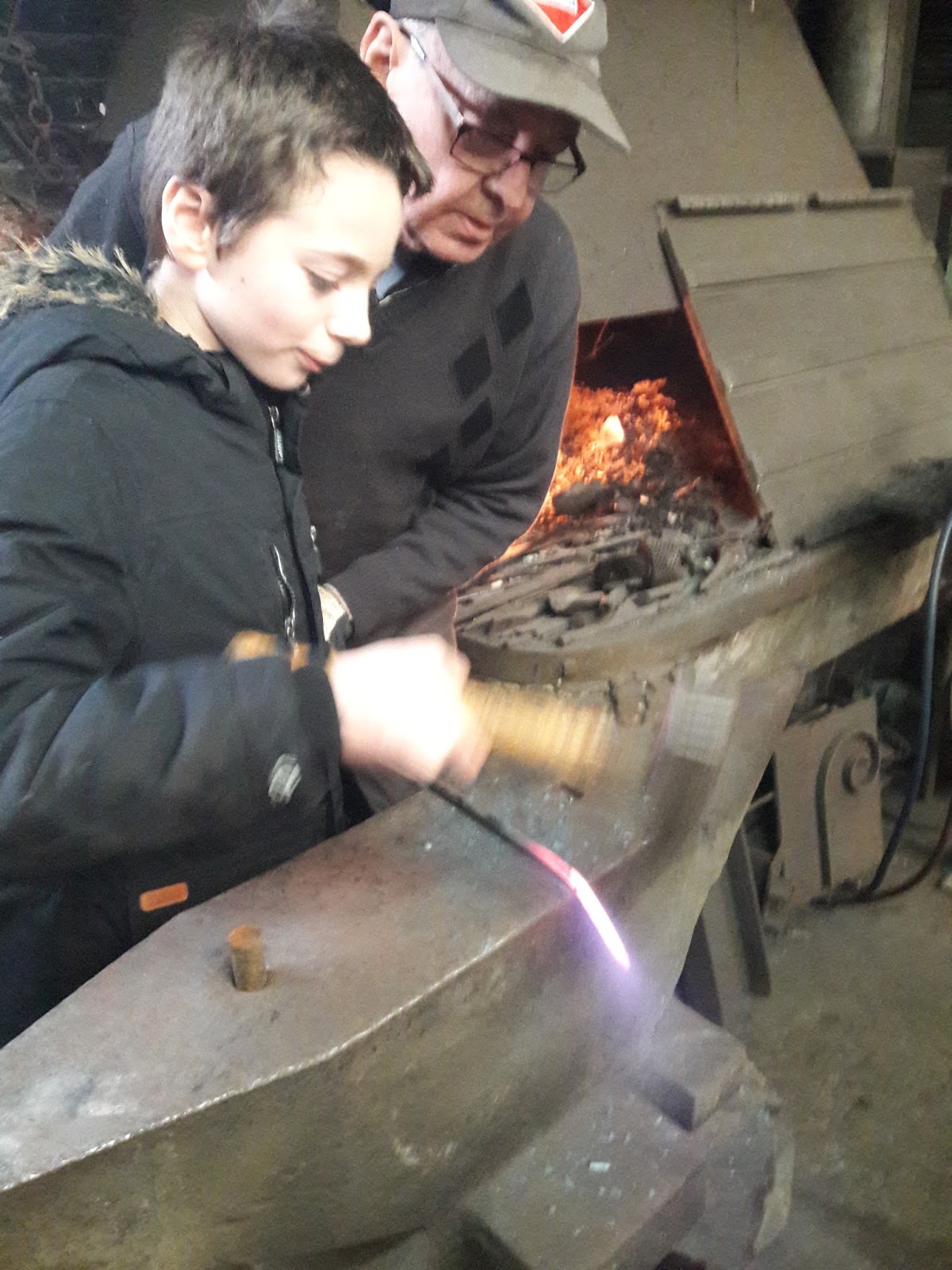 De smid liet ons vanalles zien: smeden, de klopmachine, de zaagmachine een draaibank en enkele mooie handgemaakte werkjes, waaronder een krokodil.