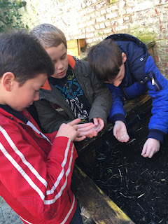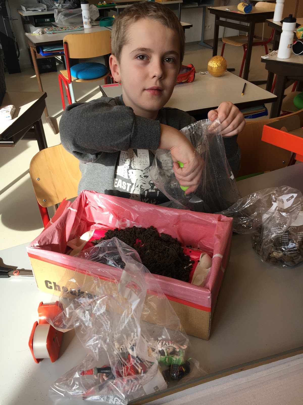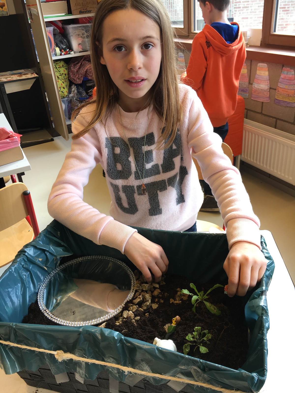 Gevuld met echte aarde en zelf 'geplukte' plantjes (onkruid) uit de plantenbakken! Ze gingen aan de slag met steentjes, mini-diertjes en andere tuinspeelgoedjes, aluminiumfolie als vijvertje en van tandenstokertjes maakten ze een hek! Bravo!