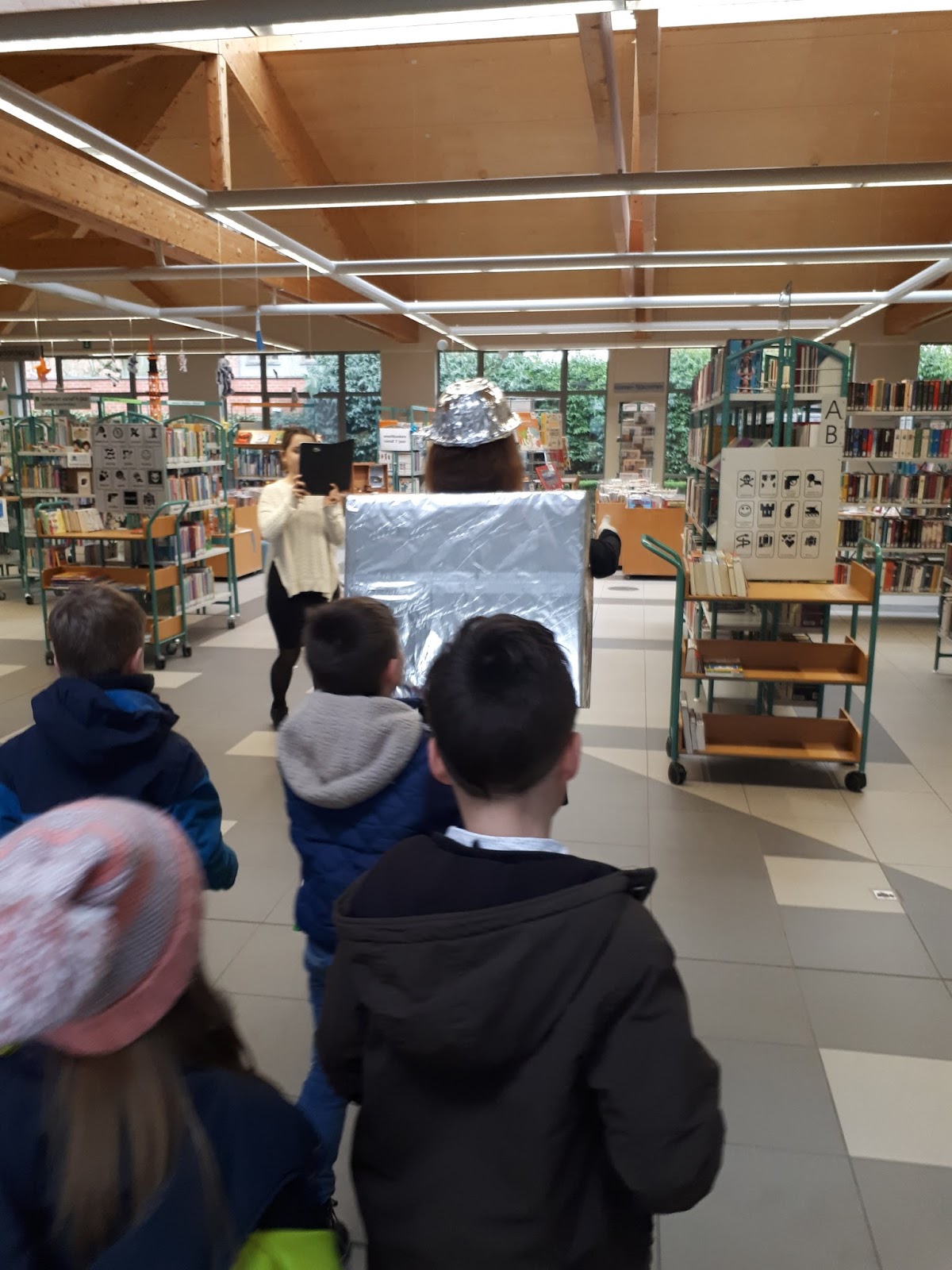 De professor las ons ook een verhaal voor over Tobor de robot, we vonden het heel mooi. We mochten ook robotstickers volgen op de vloer en kwamen telkens bij een ander soort boekjes terecht. Nu kennen we de bib veel beter! We gaan zeker nog terug! Bedankt robot en professor!
