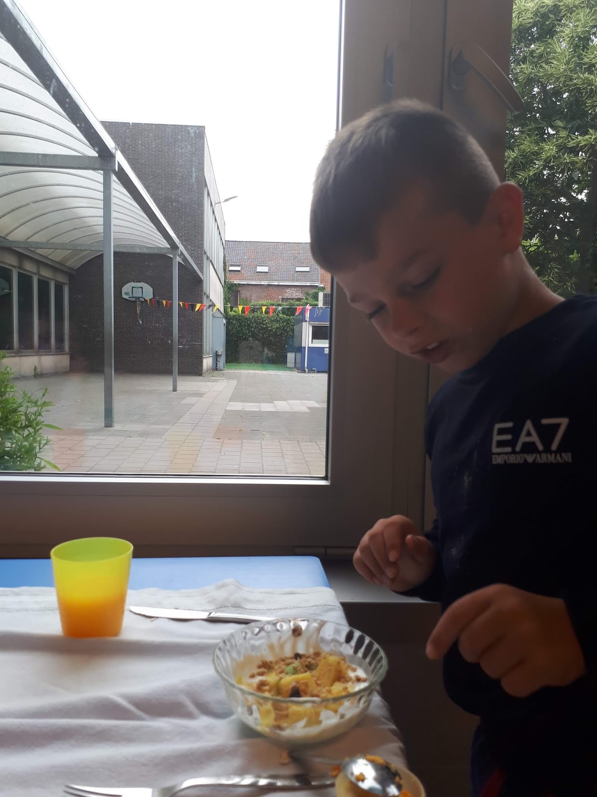 We leren deze maand over gezonde voeding! Het ontbijt is daarin heel belangrijk! Daarom hebben juf Siegke en juf Greet deze morgen de duplootjes verrast met een superlekker, maar vooral gezond ontbijt! Ze genoten van versgeperst fruitsap, een gekookt eitje, verse fruitsalade, meergranenbrood, aardbeienconfituur, kaas, natuuryoghurt en granola! mmm dat was smullen!