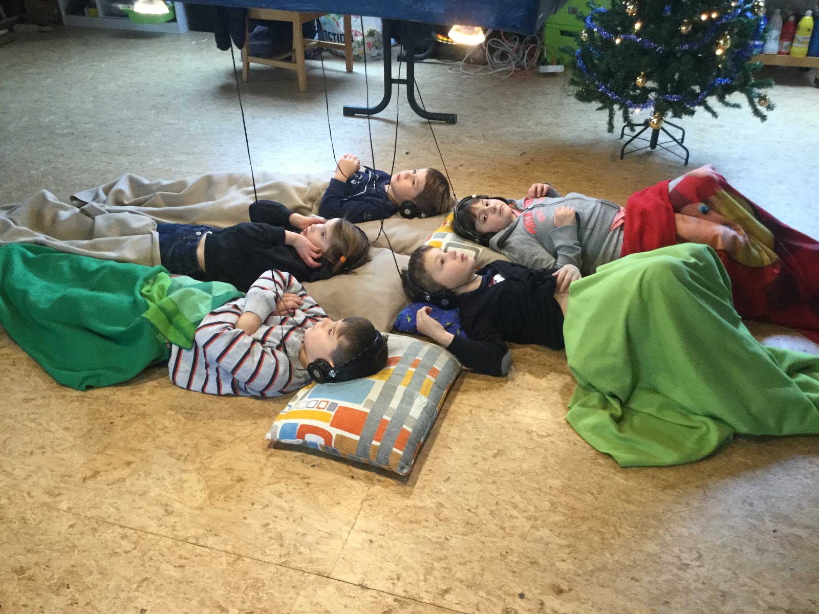 Dat namen we dan ook letterlijk: lekker warm ingeduffeld onder een dekentje, op een lekker zacht kussentje. En op het hoofd: een koptelefoon, waarlangs we luisterden naar ons schooleigen luisterverhaal 'De Boom en de Houthakker'.