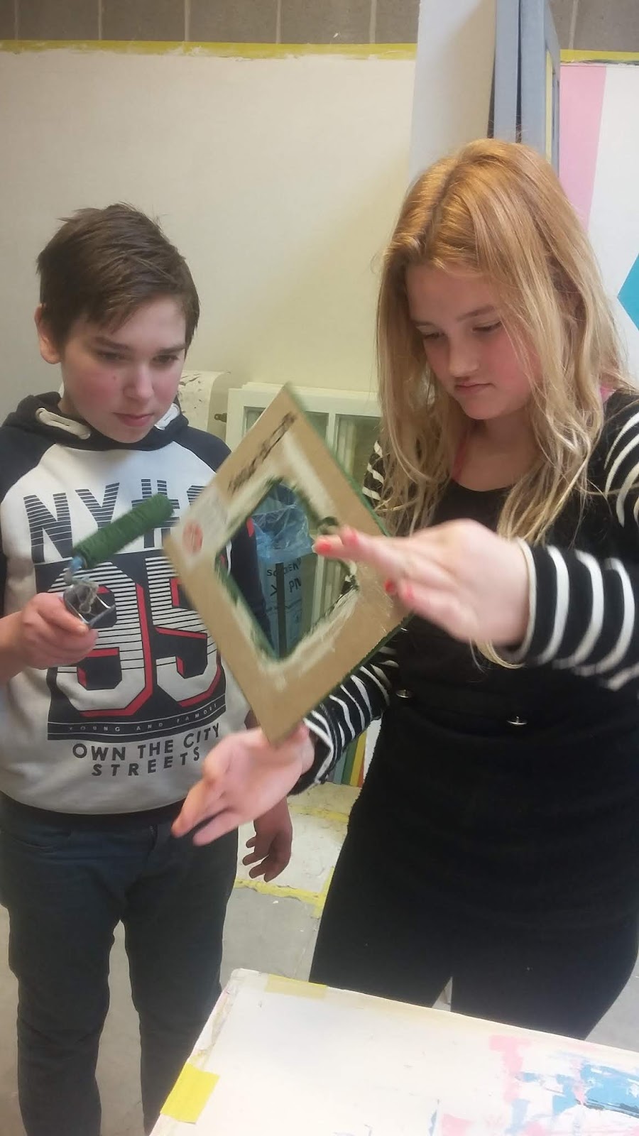 Heleonore en Dario helpen elkaar bij het beschilderen van een fotokader.