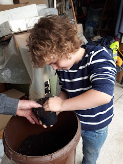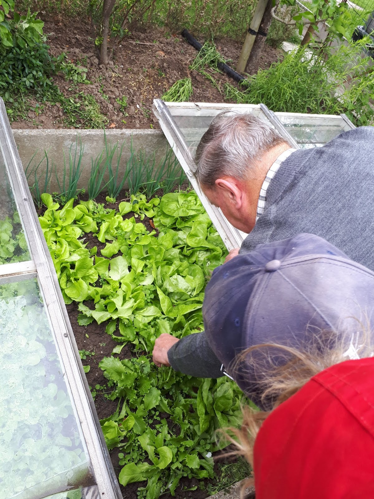Toen gingen we ook een kijkje nemen in de moestuin. Er was al vanalles gezaaid en geplant: aardappelen, salade, ajuin, erwtjes, courgette, peterselie,...