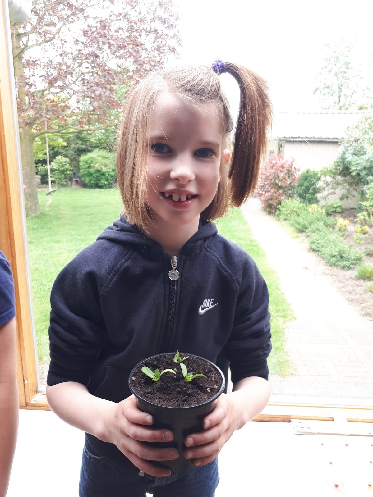 De papa van juf Greet had zaadjes van bloemen gezaaid in een pot en die waren nu al kleine plantjes geworden. We mochten elk 3 zo een plantjes in een bloempot planten! We schepten eerst potgrond in ons potje en maakten toen 3 gaatjes waar we de plantjes instopten . Nu nog de gaatjes goed dicht doen en water geven en klaar is Kees!