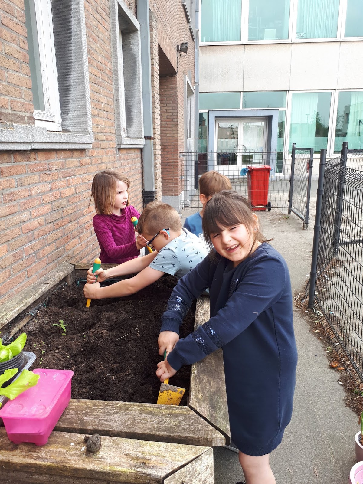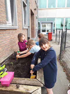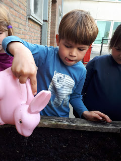 We gingen aan de slag met schep en hark en woelden de aarde om in onze moestuinbak. Daarna mochten we sla planten en radijsjes zaaien. Juf had ook nog wat bloembollen van narcissen die we er ook bij plantten. Nu nog water geven met de gieter en wachten maar...