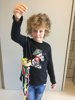 Een windgong maakt geluid wanneer de wind er doorheen blaast. Onze Duplo's probeerden kuntselden een windgong ineen met kralen, knopen en houten staafjes.