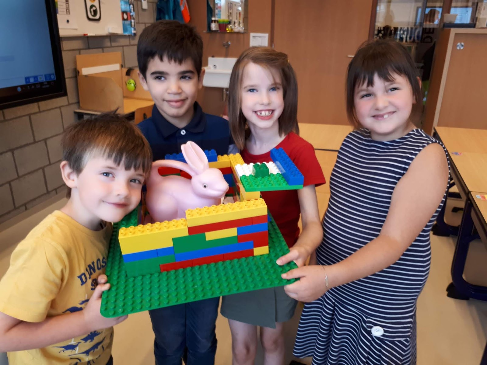 We hebben de eerste dag het grote duploganzenspel gespeeld. Als we goed samenwerkten, konden we het konijntje bevrijden en... het is ons gelukt! Nu zit ons konijntje veilig in ons zelfgebouwd duplohuisje!