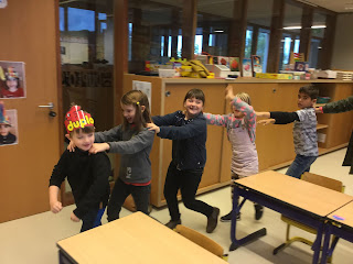 Een verjaardag mag gevierd worden. Vandaag werd Yarne 7 jaar. Dat viert hij graag in stijl: met een polonaise door de klas ('op dat liedje dat we vaak zingen in de school).