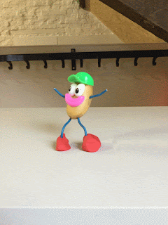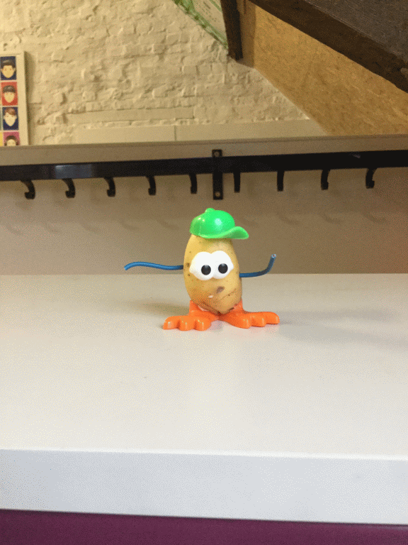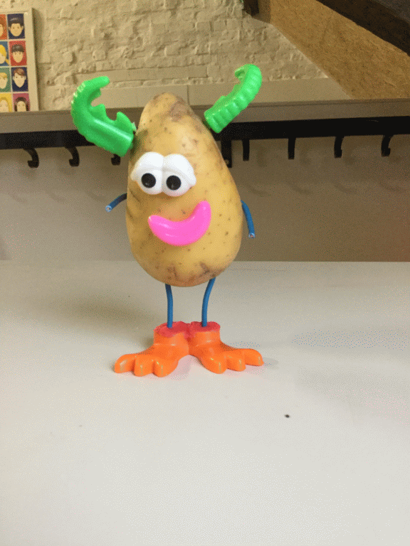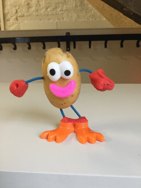 Van aardappelen kan je ook leuke popjes maken. Als je die dan een aantal keer fotografeert en je laat die blijvend achter elkaar afspelen, dan krijg je een 'geanimeerde gif'. Deze zie je ook wel eens verschijnen in Whatsapp- of Messengerberichtjes.