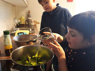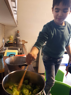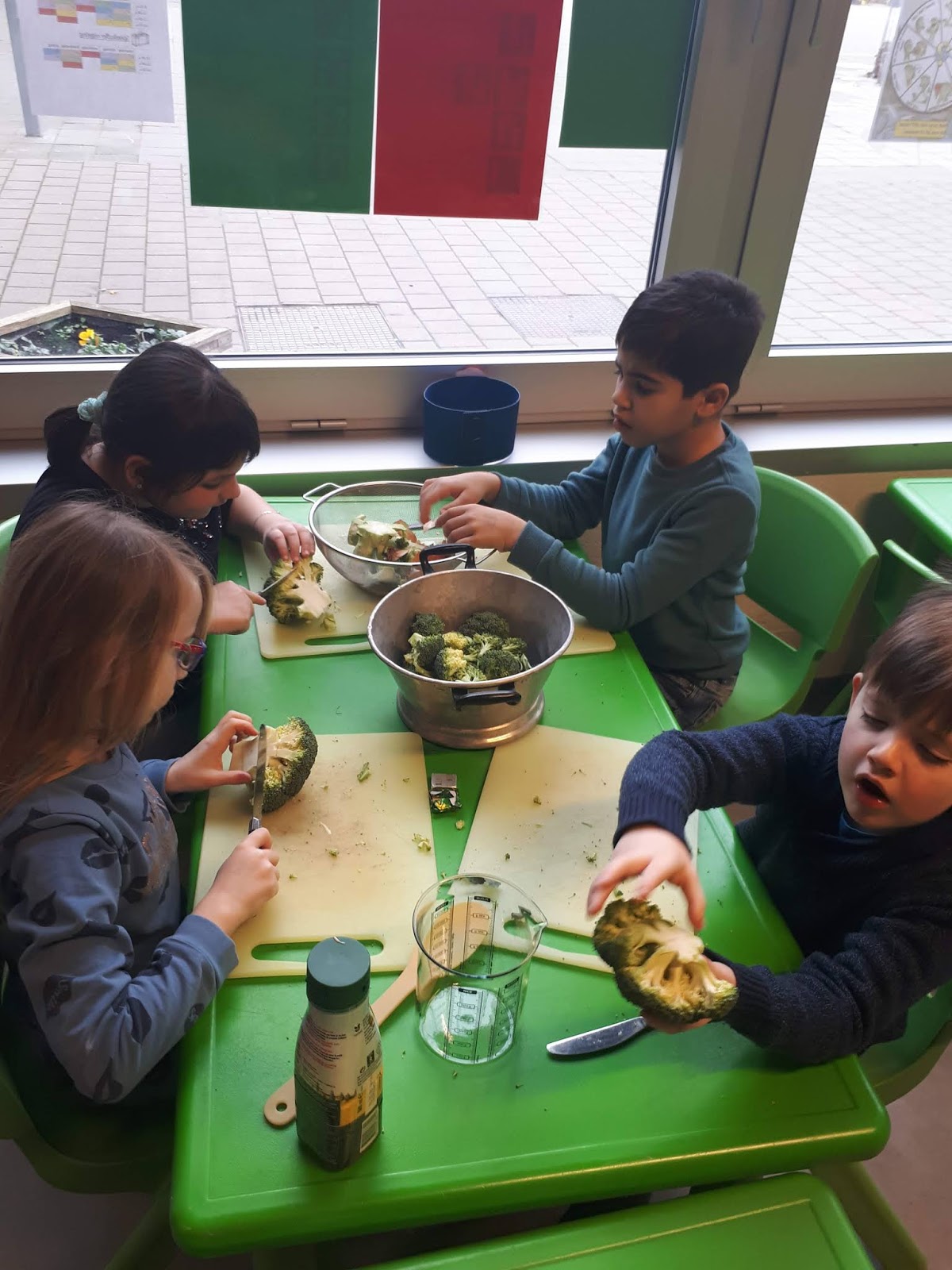 In de namiddag maakten we lettersoep. We lazen stap voor stap het recept en voerden uit! Eerst groenten snijden, wassen en stoven. Daarna water en bouillonblokjes toevoegen en laten koken! En niet te vergeten: veel lettertjes toevoegen!!!