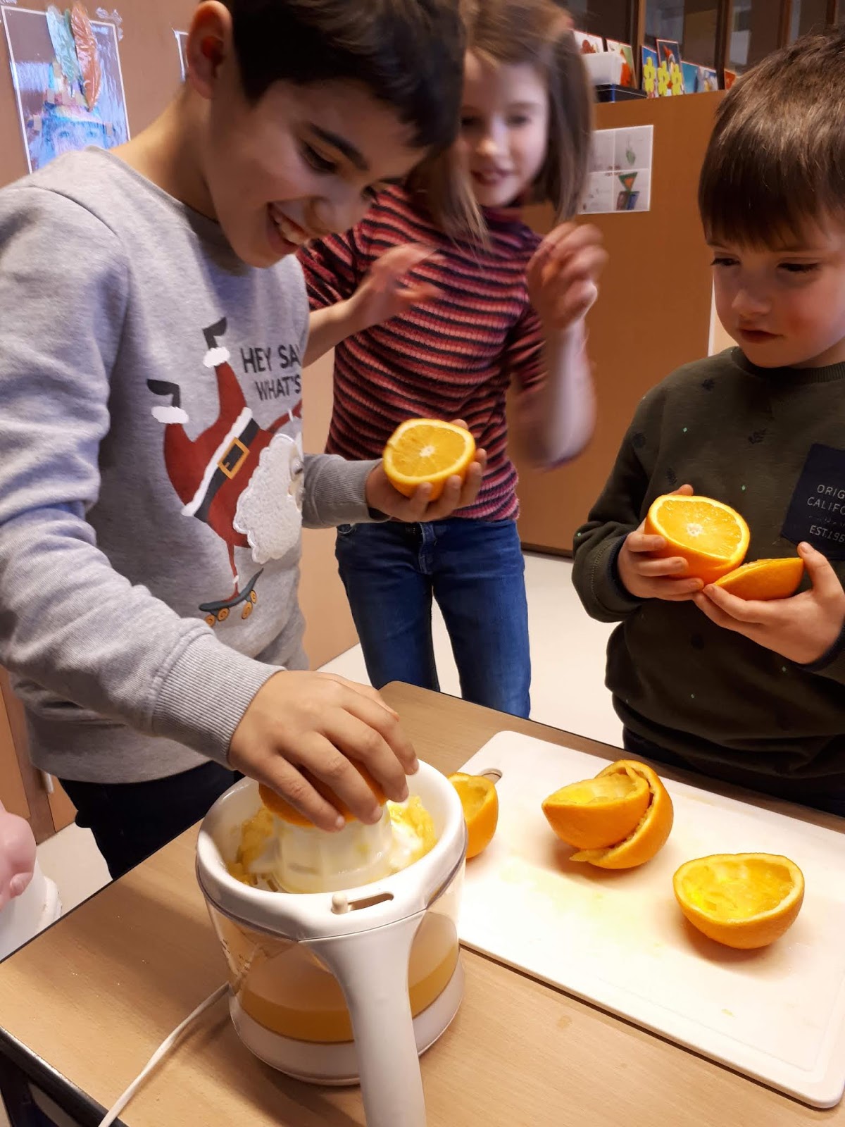 We konden het toen raden: we maken versgeperst fruitsap! We leerden hoe we de appelsien moesten snijden en persten het sap er uit! En dan proeven....: GEZONDHEID!!!!