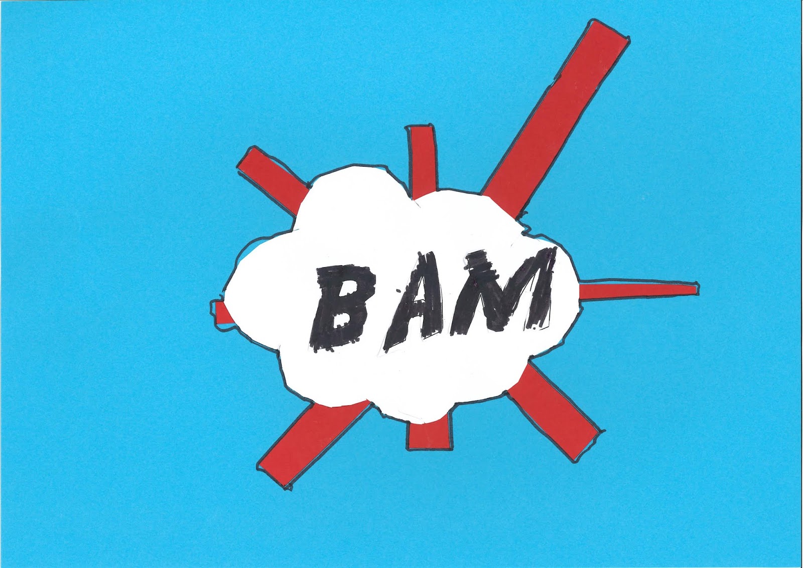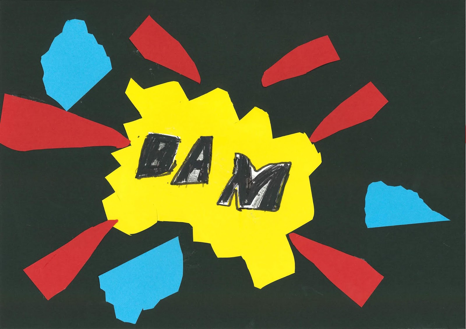 Lichtenstein w kunstenaar die grote schilderijen maakte die op striptekeningen leken. Groot geschilderde woorden gaven het bijpassende geluid weer. Wij probeerden ook geluid visueel voor te stellen.