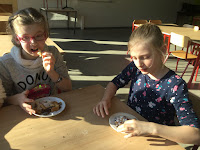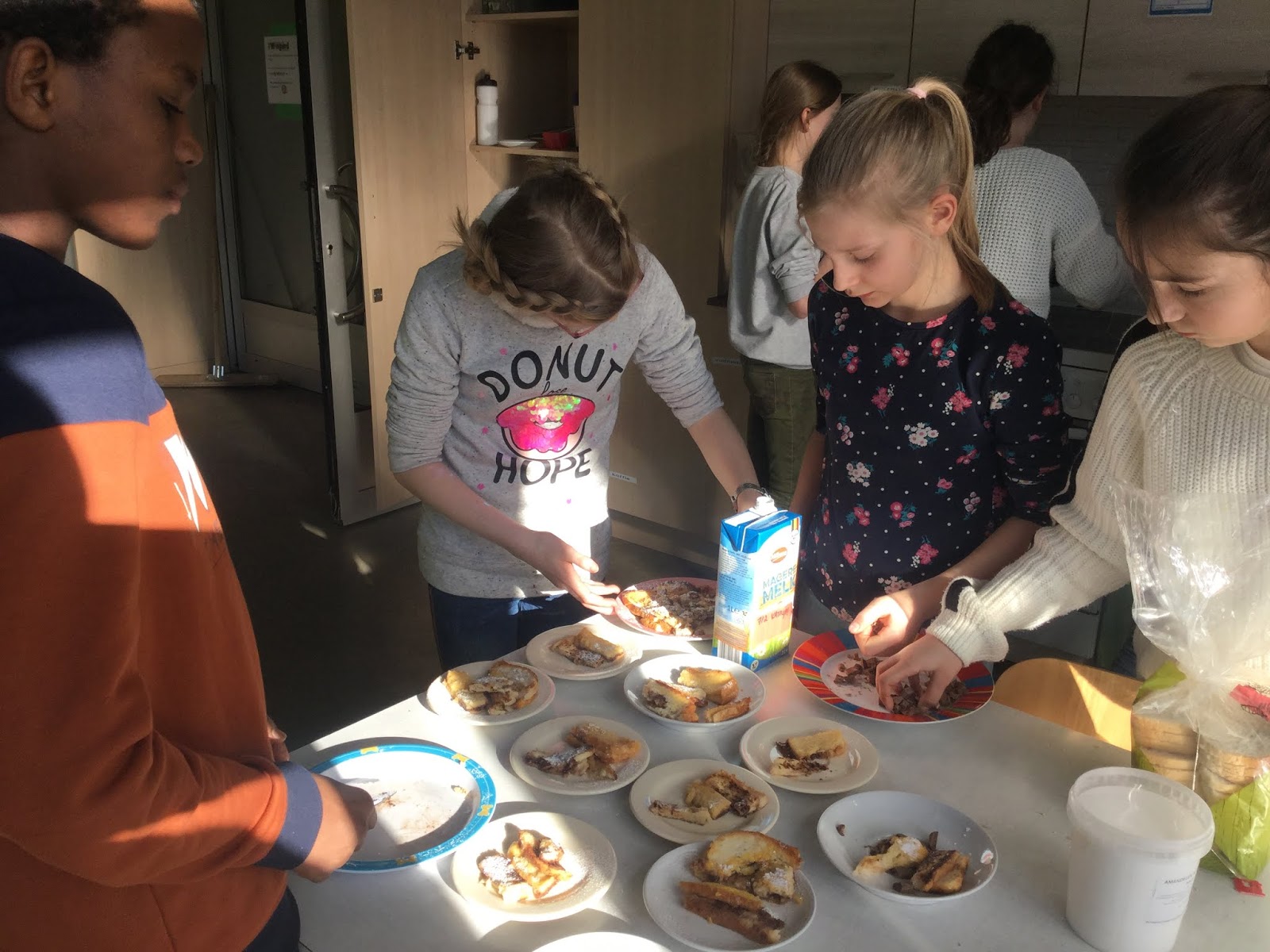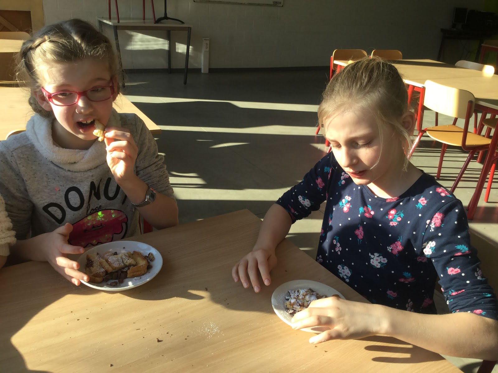 De leesvlaggenslinger van de memory's is bijna helemaal vol. Tijd voor alweer een lekkere beloning! Het receptje vonden we in het ketnetkookboek: soldaatjes met chocolade. Ook wel wentelteefjes of verloren brood genoemd. Maar dan met chocolade ertussen. Njammie! Ook Lize van de duplo's hielp mee. Dat vond ze natuurlijk superfijn. En lekker!
