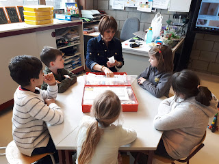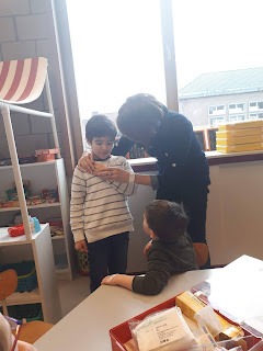 We leerden het noodnummer, nl 112 gebruiken en hoe we moeten bellen naar de hulpdiensten als er iets ernstigs gebeurt. Ze toonde ons hoe je een schaafwonde kan verzorgen: eerst ontsmetten en dan pleister er op. Ook hoe we een verstuiking moeten aanpakken: eerst ontzwellen met cold pack en erna verband om doen!! We gingen allen naar huis met een verbandje om en fopten onze mama's!!
