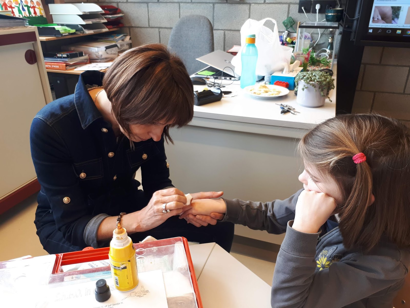 We leerden het noodnummer, nl 112 gebruiken en hoe we moeten bellen naar de hulpdiensten als er iets ernstigs gebeurt. Ze toonde ons hoe je een schaafwonde kan verzorgen: eerst ontsmetten en dan pleister er op. Ook hoe we een verstuiking moeten aanpakken: eerst ontzwellen met cold pack en erna verband om doen!! We gingen allen naar huis met een verbandje om en fopten onze mama's!!